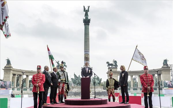 A Hősök emlékkövének megkoszorúzásával, a versenyző 71 település lovasának ünnepélyes fogadalomtételével és történelmi lovas felvonulással megkezdődött a 9. Nemzeti Vágta szombaton Budapesten,